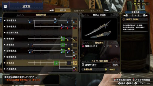 ナルガクルガの太刀です!お世話になった方も多いでしょう夜刀【月影】の最終強化です!圧倒的な切れ味と高い会心率が特徴的です!