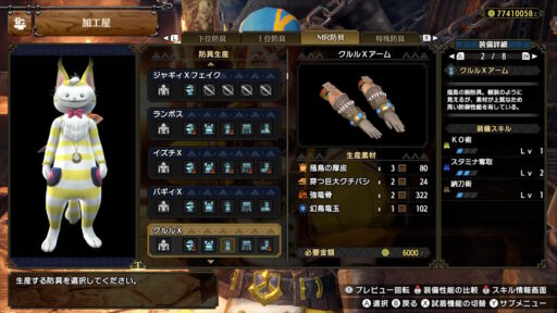 こんな感じです!おしゃれなだけではなく、機能面も十分なことが伝わる防具説明ですね!マスターランクの素材はとても貴重で高級品なことも読み取れます!